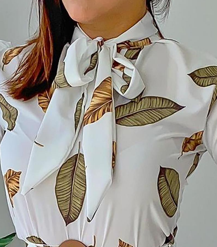Women's White Leaf Print Long Sleeve Two-piece Set