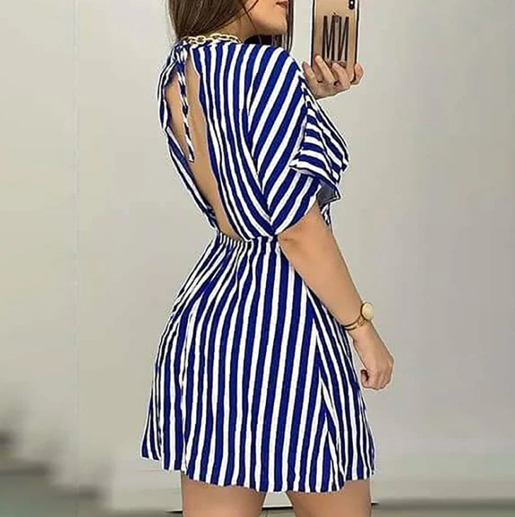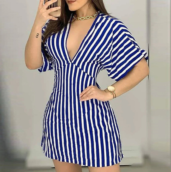 Deep V-Neck Short-Sleeved Striped Sexy Dress