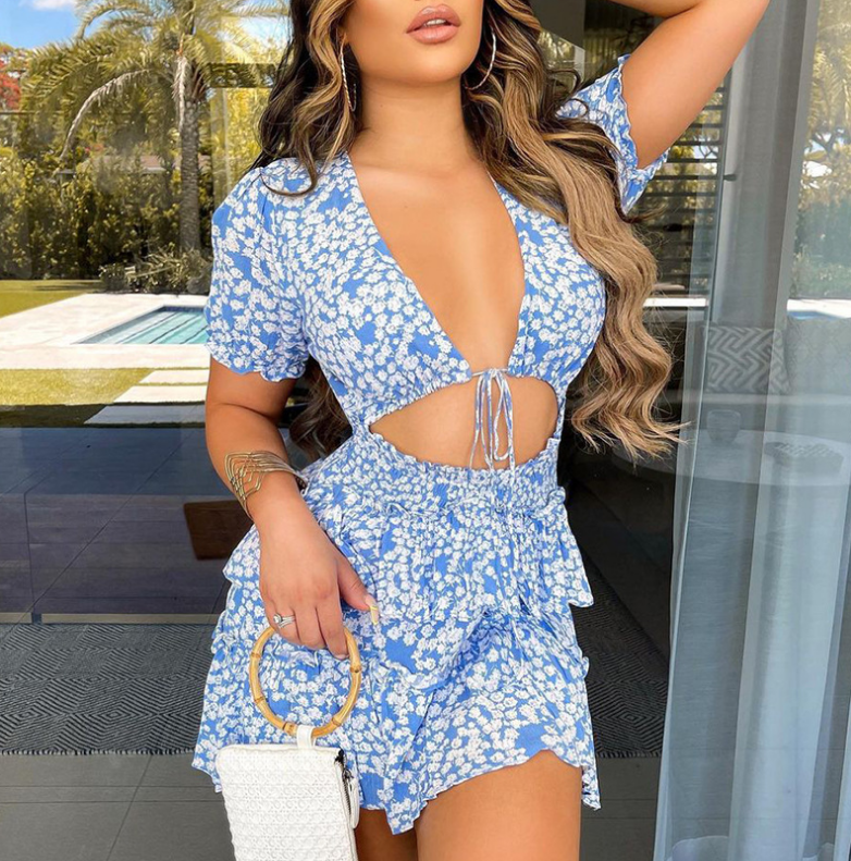 Women Floral High Waist Blue Dress