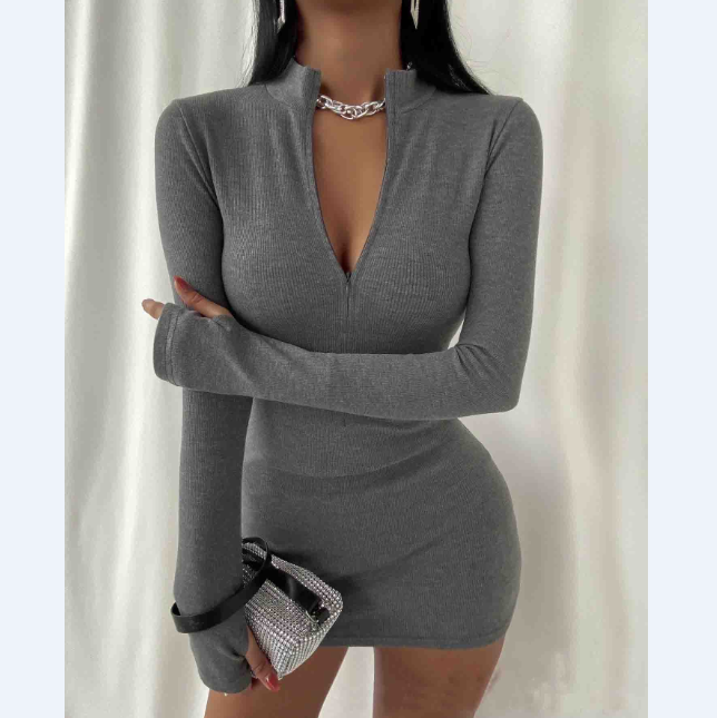 Solid Color High Neck Zipper V-Neck Tight-Fitting Bag Hip Dress