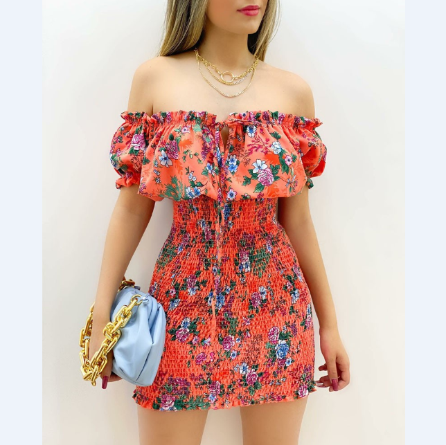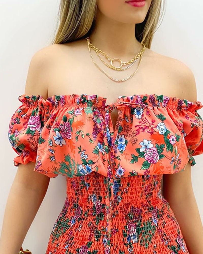 Short Sleeve Floral Print Off Shoulder High Waist Mini Dress