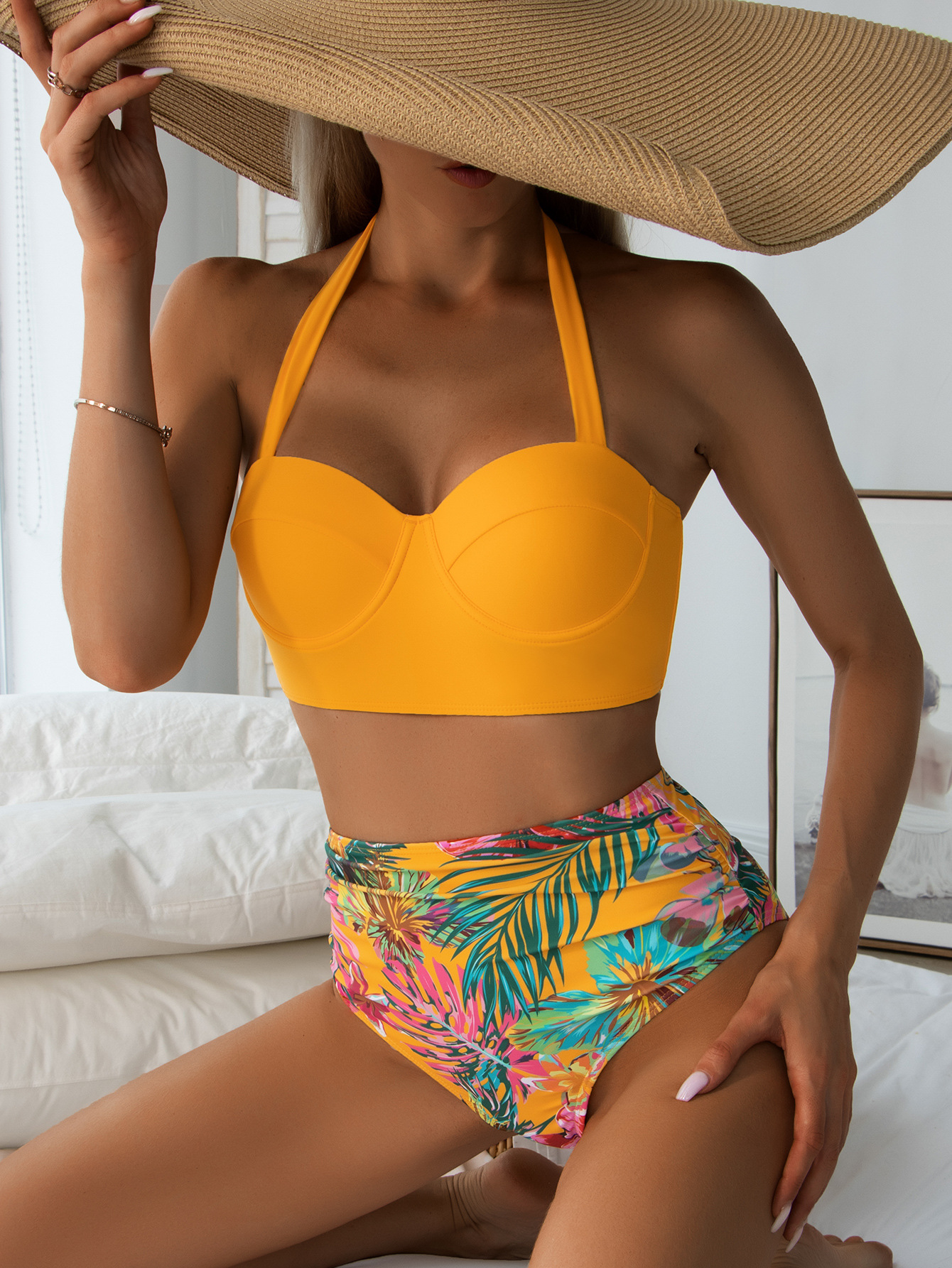 Solid Color Sexy Deep V Open Back High Waist One-Piece Swimsuit