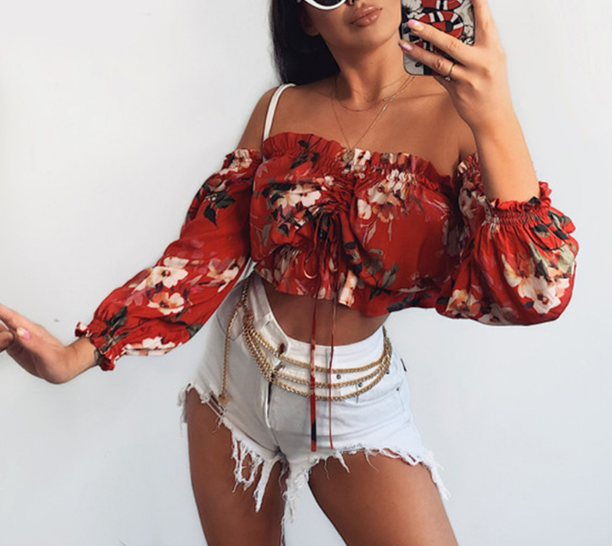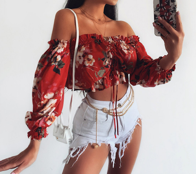 Off-The-Shoulder Sexy Print Long-Sleeved Shirt Tops