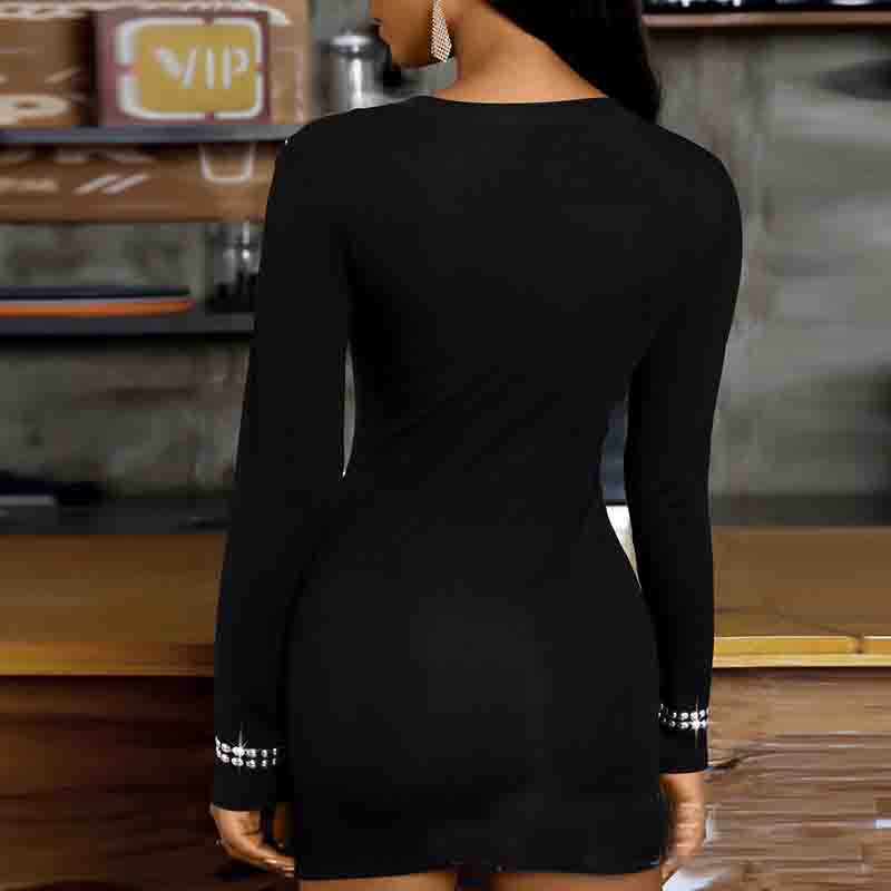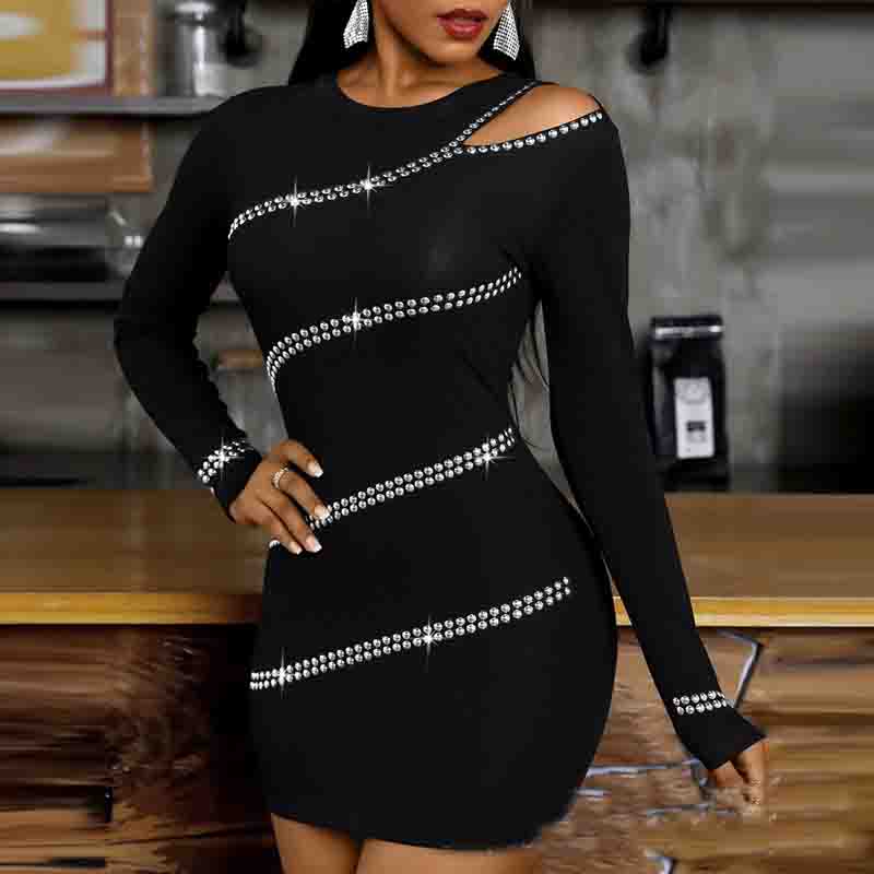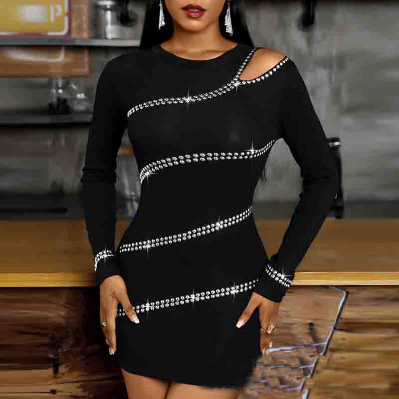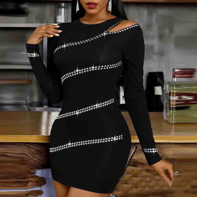 Temperament Strapless Hot Rhinestone Slim Long-Sleeved Hip Dress