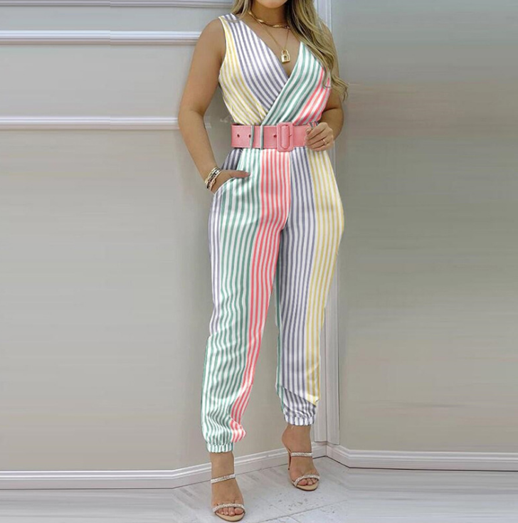 Women's Striped V-neck Vest Sleeveless Jumpsuit