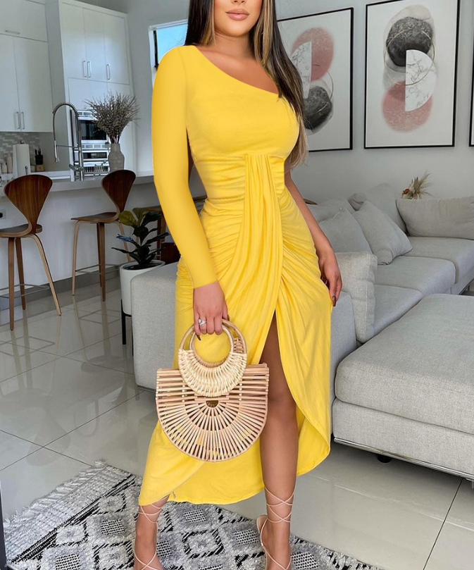 Solid Color High Waist Sexy Yellow Split Dress