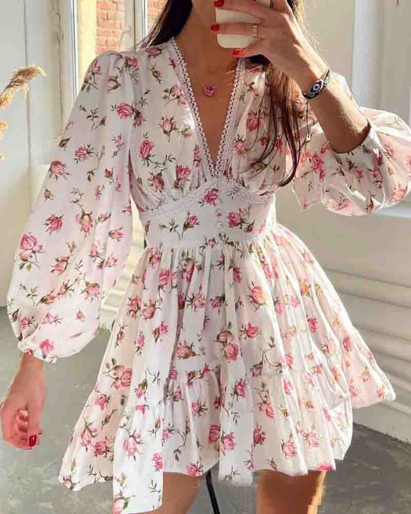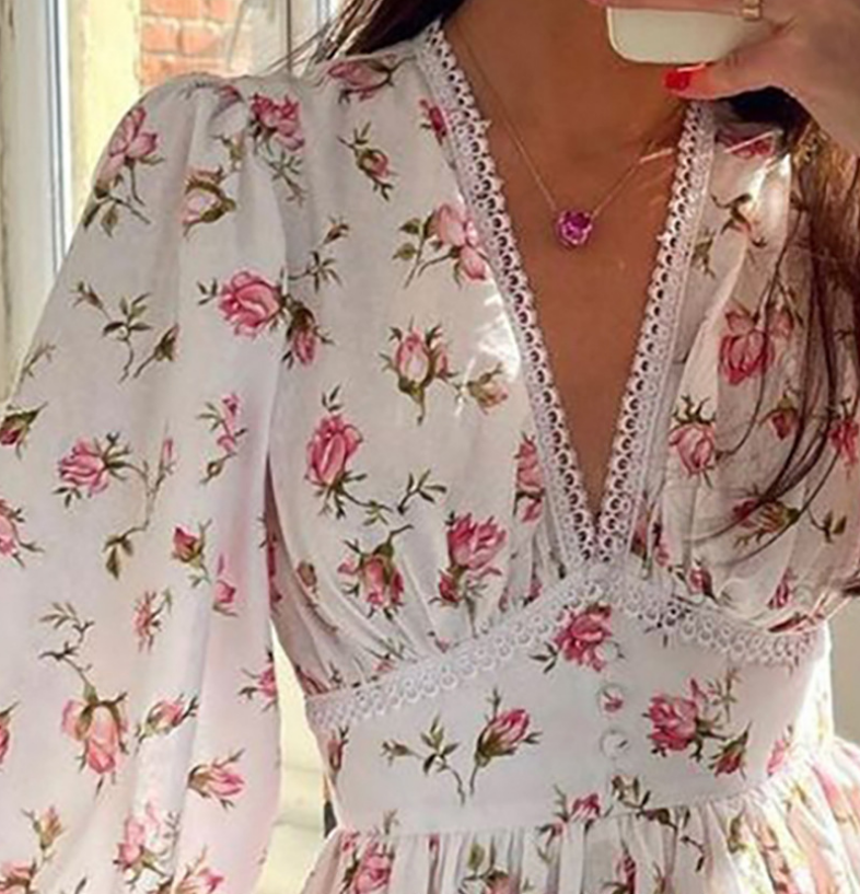 Long Sleeve Chiffon V-Neck Printed Lace Dress
