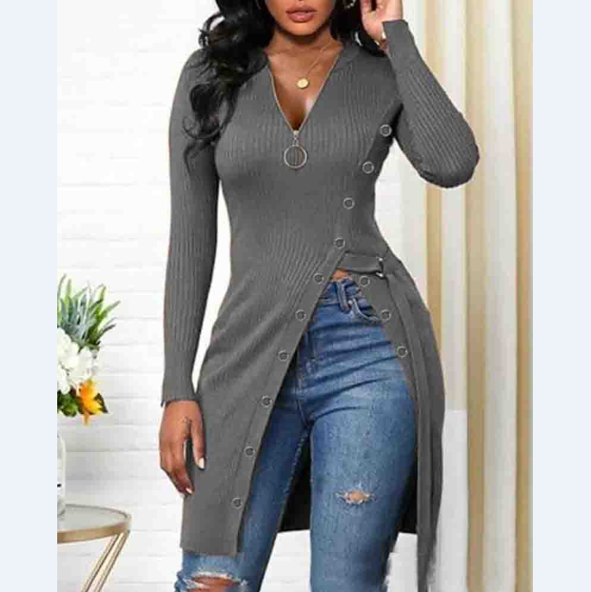 Solid Color V-Neck Long-Sleeved Split T-Shirt