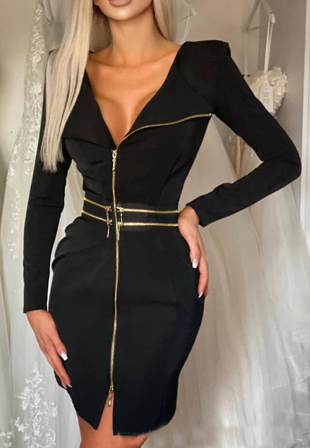 Solid Color Women'S Black Zippered Long Sleeved Dress
