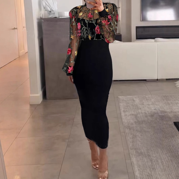 Fashion Rose Embroidery Mesh Patchwork Long Sleeved Plum Dress